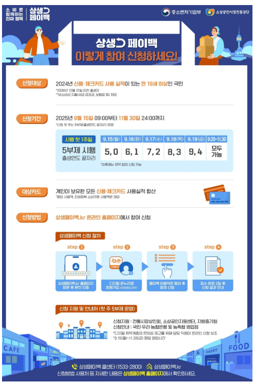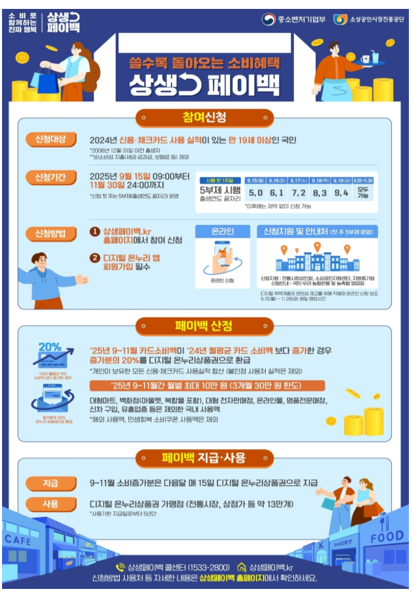 정부가 추진하는 상생페이백은 일정 기간 동안 사용한 카드 소비액에 따라 최대 30만원까지 환급받을 수 있는 제도입니다. 2025년 상생페이백은 신청 조건, 환급 일정, 누리집(공식 홈페이지)에서의 신청 절차가 핵심인데요. 이번 글에서는 신청 방법부터 환급 조회까지 꼭 알아야 할 내용을 정리했습니다.