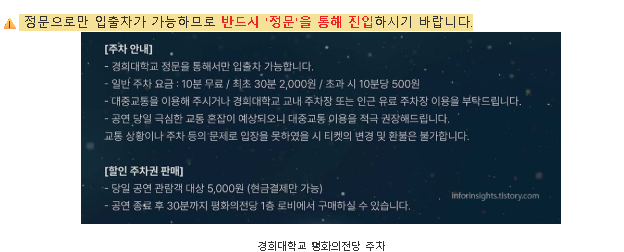 경희대 평화의 전당은 대중교통 접근성이 괜찮은 편이지만, 주차 공간은 제한적이었습니다. 공연 시간에 맞춰 여유 있게 도착하거나 대중교통을 활용하는 것이 훨씬 수월했습니다.
