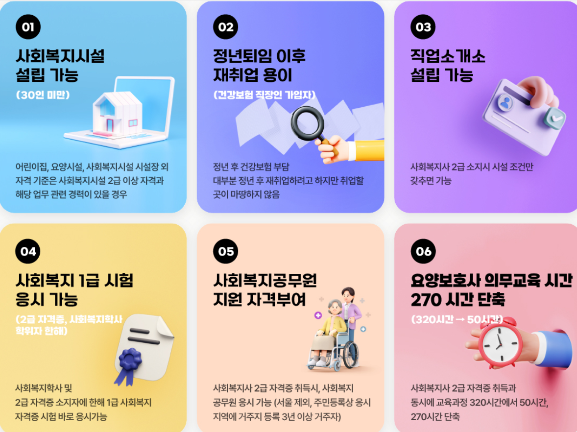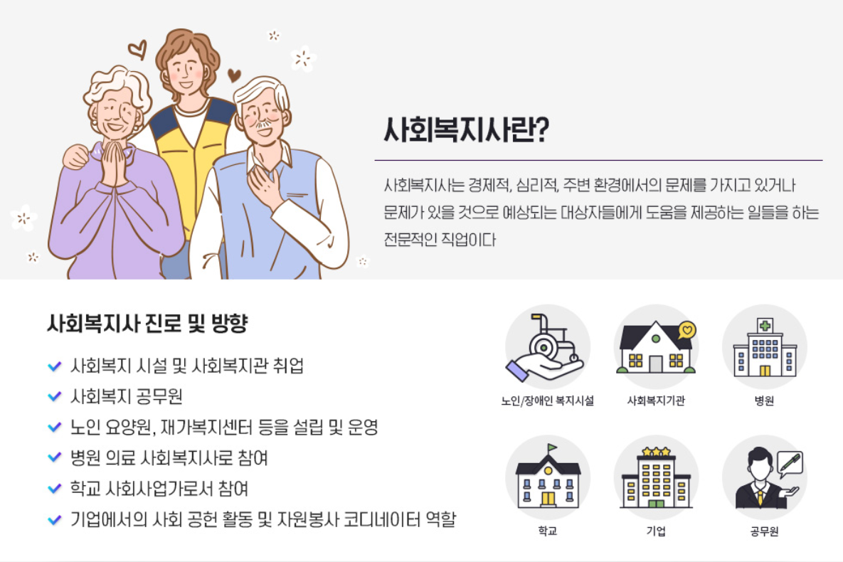 자격증을 취득하면 복지관, 요양기관, 사회복지 관련 단체 등 다양한 분야에서 활동할 수 있습니다. 특히 직장인이라면 경력을 전환하거나 제2의 커리어를 준비하는 데 좋은 선택이 될 수 있습니다.