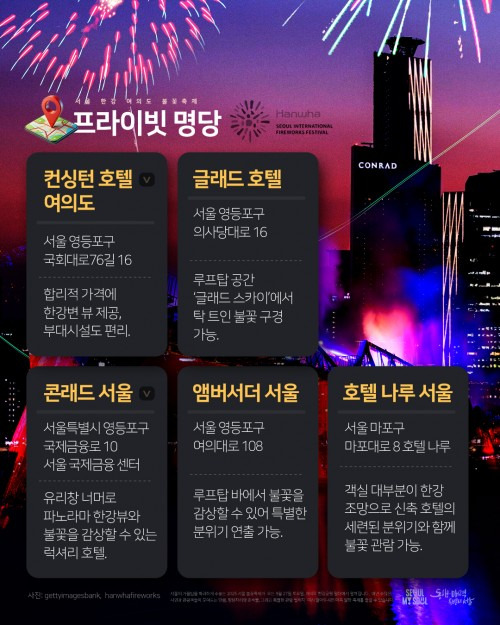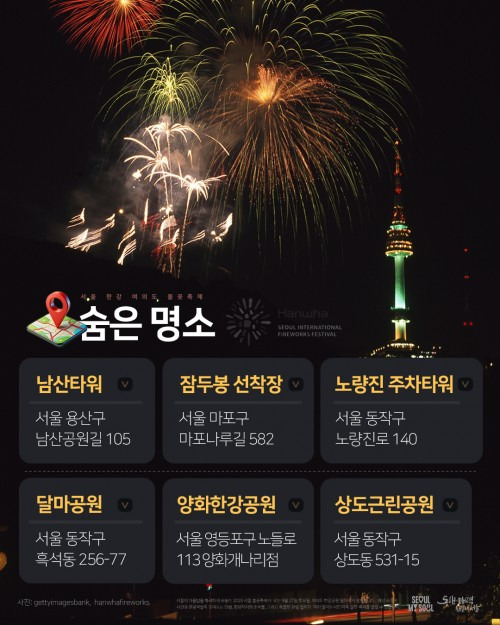 불꽃을 가장 가까이 즐기고 싶다면 여의도 한강공원이 대표적입니다. 하지만 붐비는 것을 피하고 싶다면 이촌한강공원, 노들섬, 반포 한강공원 등도 좋은 대안이 됩니다.