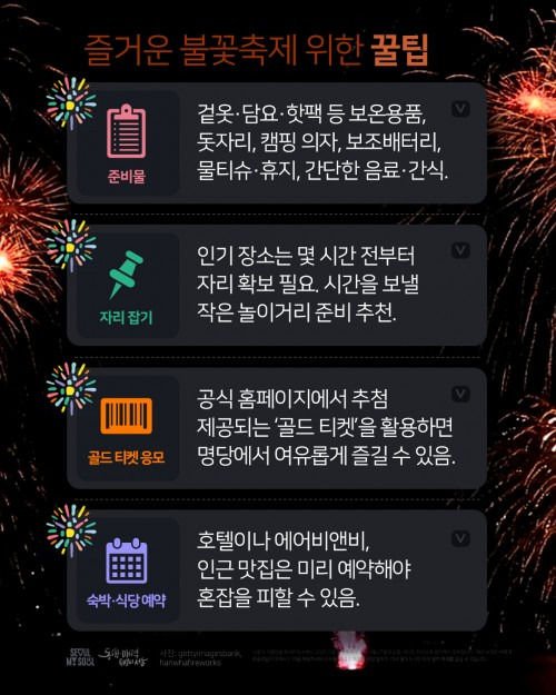 | 여의도 한강공원 | 대표 명당, 불꽃 가까움 | 매우 혼잡 | 오후 2~3시 |