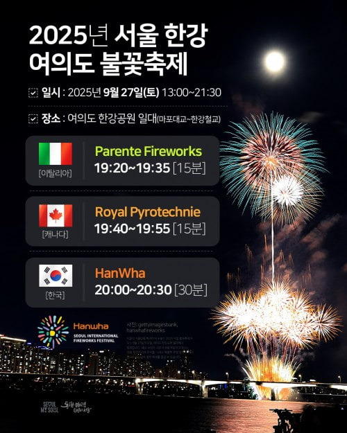 올해 축제는 9월 27일 토요일 저녁, 여의도 한강공원 일대에서 열립니다. 전 세계 불꽃 연출팀이 참여해 밤하늘을 장식할 예정이라 규모와 볼거리가 풍성합니다.