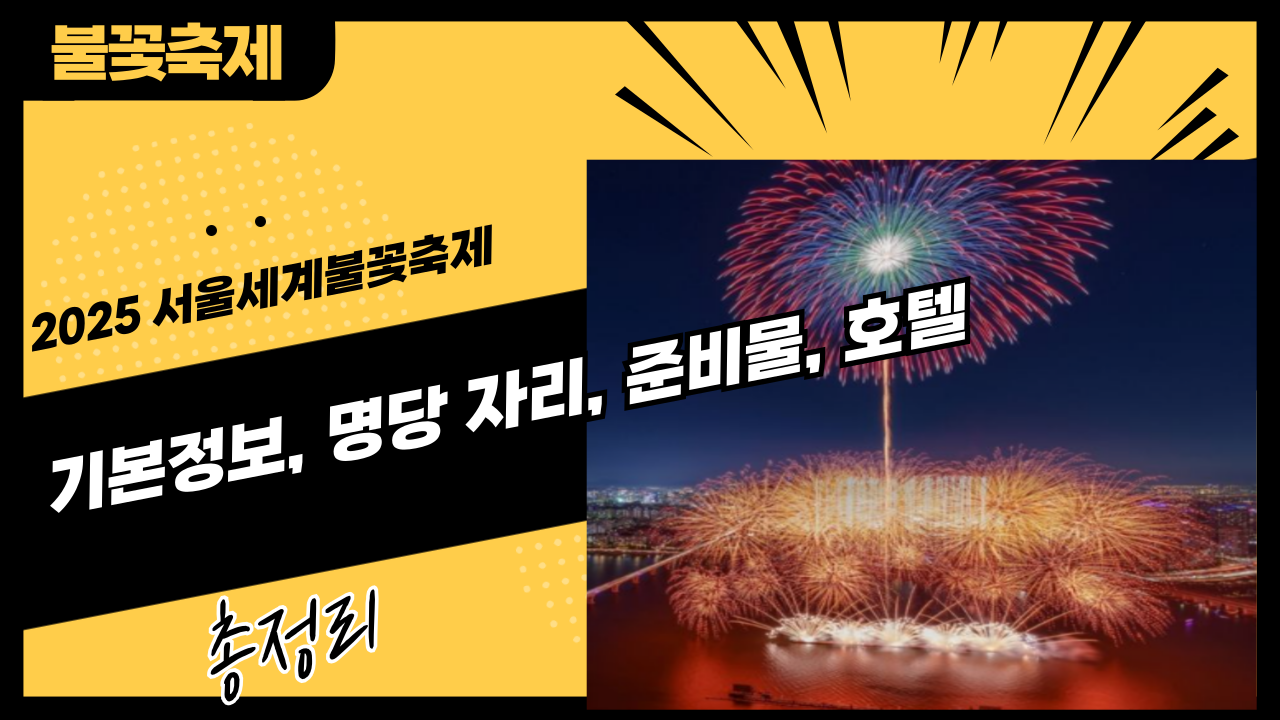 가을밤 한강을 수놓는 서울세계불꽃축제가 2025년에도 돌아옵니다. 오는 9월 27일 토요일, 여의도를 중심으로 화려한 불꽃 쇼가 펼쳐질 예정인데요. 매년 수많은 인파가 몰려드는 만큼 관람 명당, 교통통제, 즐길 거리 등을 미리 알아두면 더욱 편안하고 즐겁게 축제를 즐길 수 있습니다.