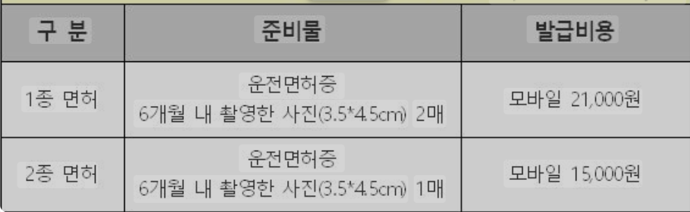 | 준비물 | 신분증, 사진, 수수료, 적성검사 | 신분증, 사진, 수수료 |