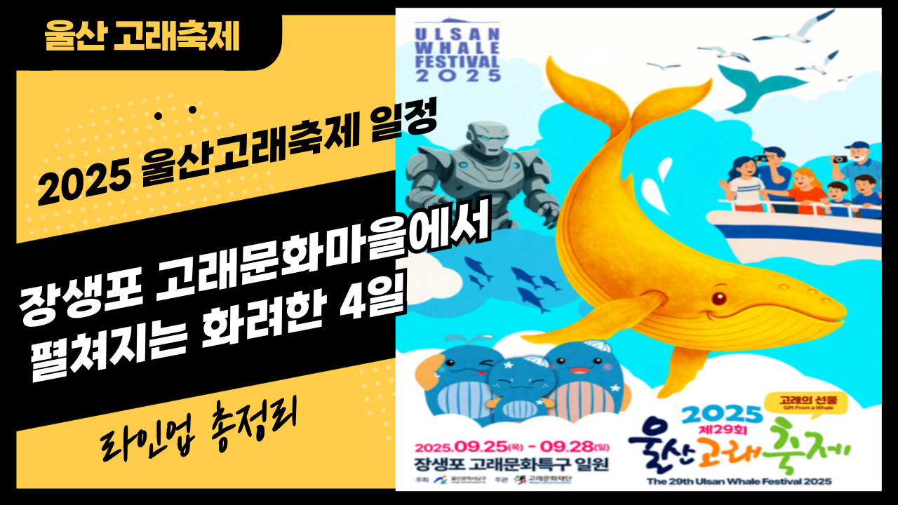 울산의 대표적인 가을 축제, 울산고래축제가 올해도 장생포 고래문화특구에서 열립니다. 2025년 9월 25일 목요일부터 9월 28일 일요일까지 4일간 이어지며, 불꽃놀이·퍼레이드·가수 공연 등 다채로운 프로그램이 준비되어 있습니다. 가족 나들이, 연인과의 데이트, 친구들과의 즐거운 추억 만들기에 모두 제격인 이번 축제의 기본 정보와 볼거리를 정리했습니다.