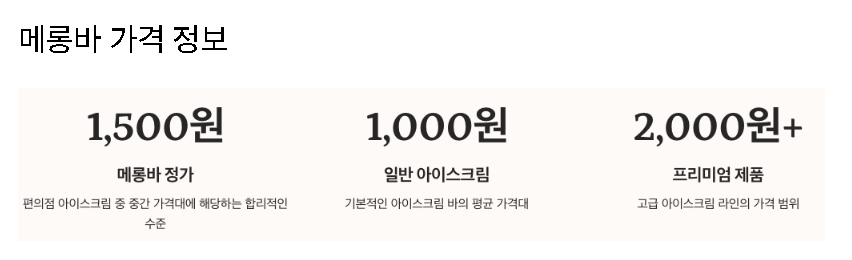 메롱바의 가격은 1,500원대로, 기존 편의점 아이스크림 가격대와 비슷합니다. 신상 아이스크림임에도 합리적인 가격 덕분에 호기심에 구매해보는 소비자가 많습니다.