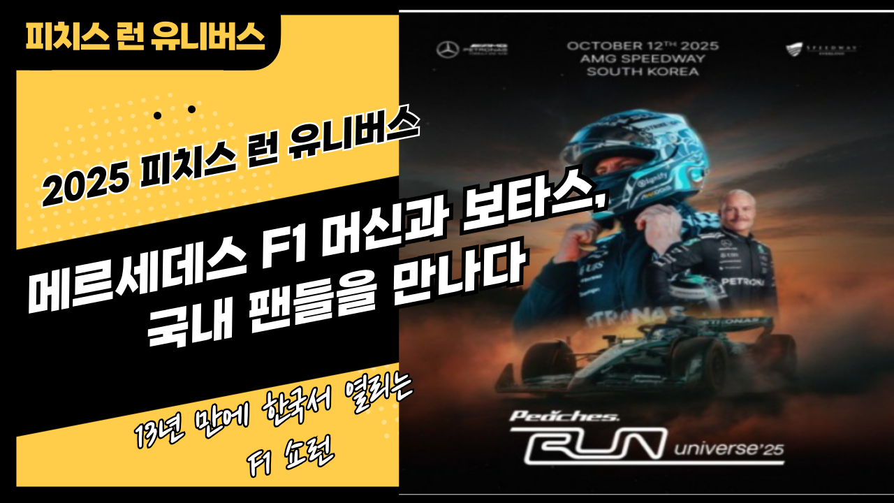 F1 팬이라면 손꼽아 기다렸던 소식! 무려 13년 만에 F1 머신 주행 이벤트가 한국에서 열립니다. 스트리트 문화 브랜드 피치스(PEACHES) 가 주최하는 피치스 런 유니버스 2025(Peaches Run Universe 2025) 가 바로 그 무대인데요. 이번 행사에서는 메르세데스-AMG 페트로나스의 F1 머신과 함께 전 메르세데스 드라이버 발테리 보타스(Valtteri Bottas) 가 직접 주행에 나서며, 국내 팬들에게 잊지 못할 장면을 선사할 예정입니다.