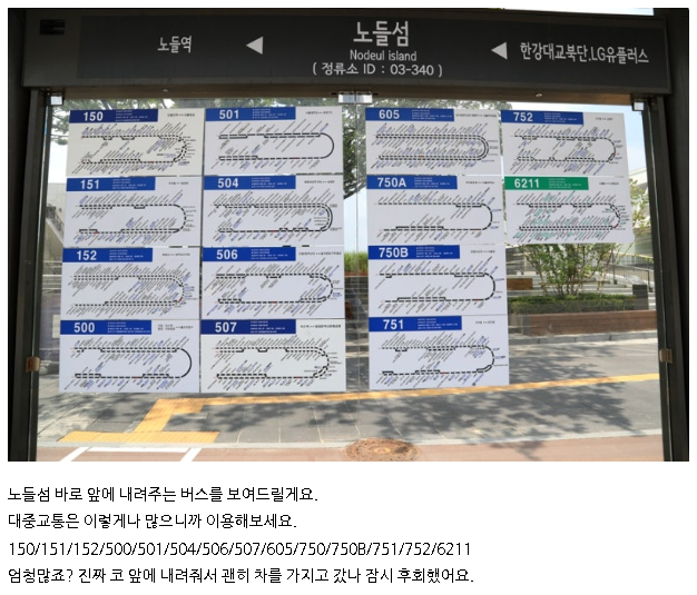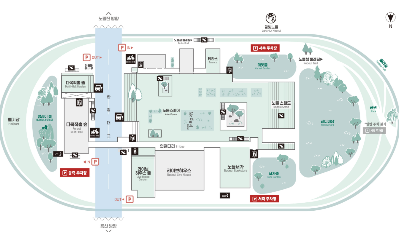 노들섬 내 주차장은 규모가 크지 않아 주말과 저녁 시간에는 금방 만차가 됩니다. 여의도나 용산 인근 주차장을 활용하거나 지하철 9호선 노들역을 이용하면 편리합니다. 대중교통으로 접근성이 좋아 차 없이도 충분히 즐길 수 있습니다.