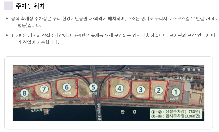 축제 기간에는 주차장이 혼잡할 수 있습니다. 구리 한강시민공원 주차장은 한정적이라 조기 만차되는 경우가 많습니다.