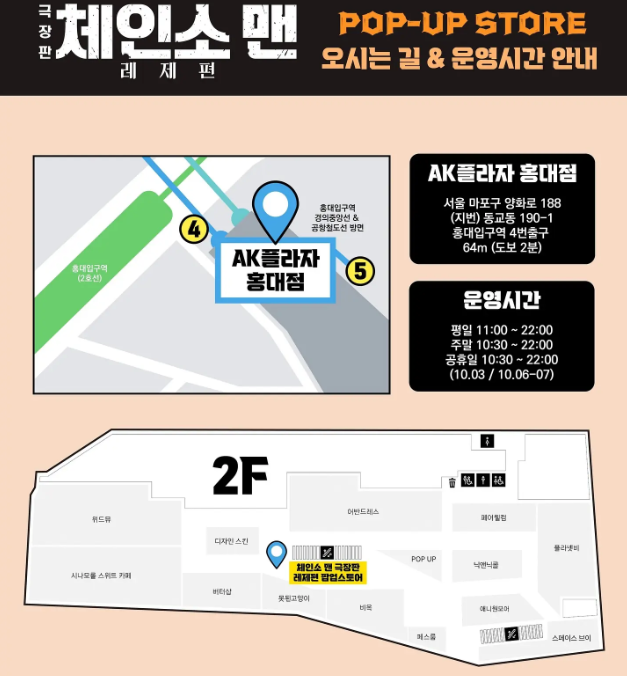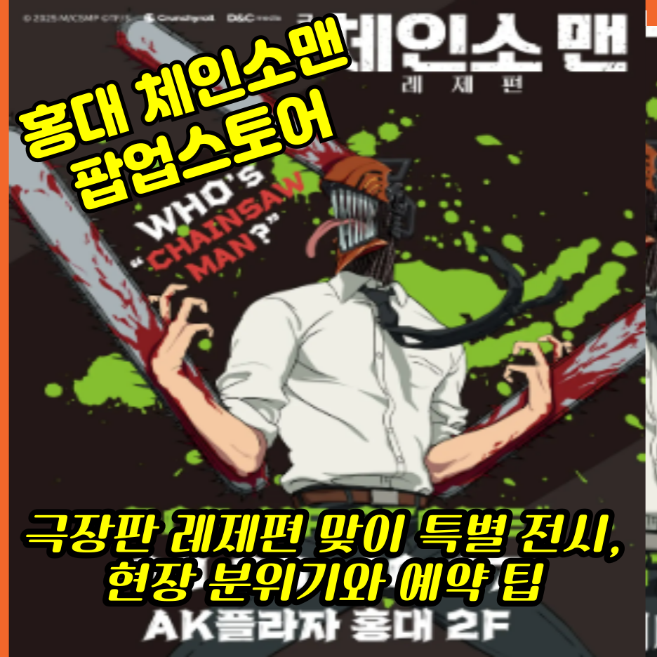 최근 홍대에서 열린 체인소맨 팝업스토어는 극장판 레제편 공개와 함께 큰 주목을 받았습니다. 애니메이션 팬들은 예매부터 입장, 전시 체험, 굿즈 구매까지 다양한 즐거움을 경험할 수 있었는데요. 이번 글에서는 홍대 AK플라자와 덕스 전시관 등에서 진행된 팝업 현장 분위기와 굿즈 후기, 그리고 방문 팁까지 정리해 보겠습니다.