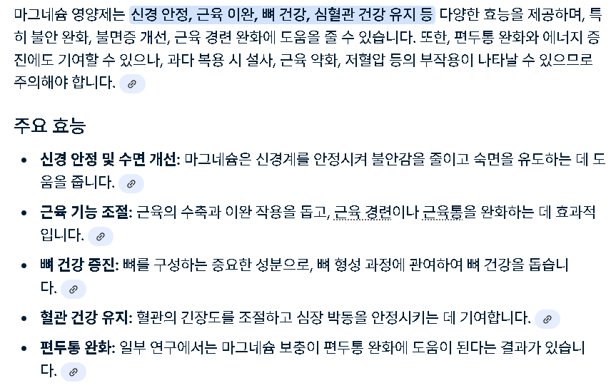 일반 성인의 권장 섭취량은 하루 약 300~350mg 수준입니다. 다만 식사로 이미 일정량을 섭취하고 있다면 영양제 용량은 이에 맞게 조절해야 합니다.