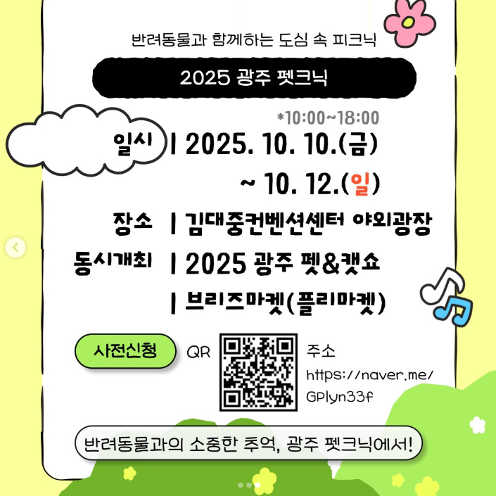 올해는 ‘광주펫크닉’이 같은 시기에 야외 행사로 함께 진행됩니다. 반려인과 반려동물이 함께 참여할 수 있는 산책 체험, 펫 포토존, 플리마켓 등이 열려 도심 속 피크닉 감성을 만끽할 수 있습니다.