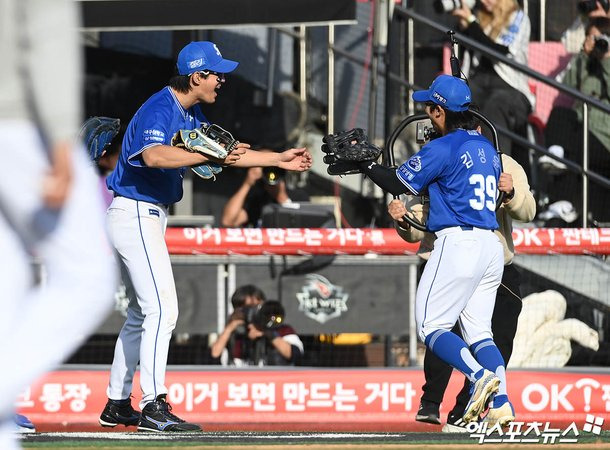 4회초, 동점이 되는 결정적인 플레이 이후 김성윤과 구자욱은 서로를 바라보며 활짝 웃었습니다. 잠시나마 긴장이 풀린 듯한 표정 속에는 “할 수 있다”는 자신감이 느껴졌습니다. 관중석에서도 두 선수의 미소에 함성이 터져 나왔습니다.