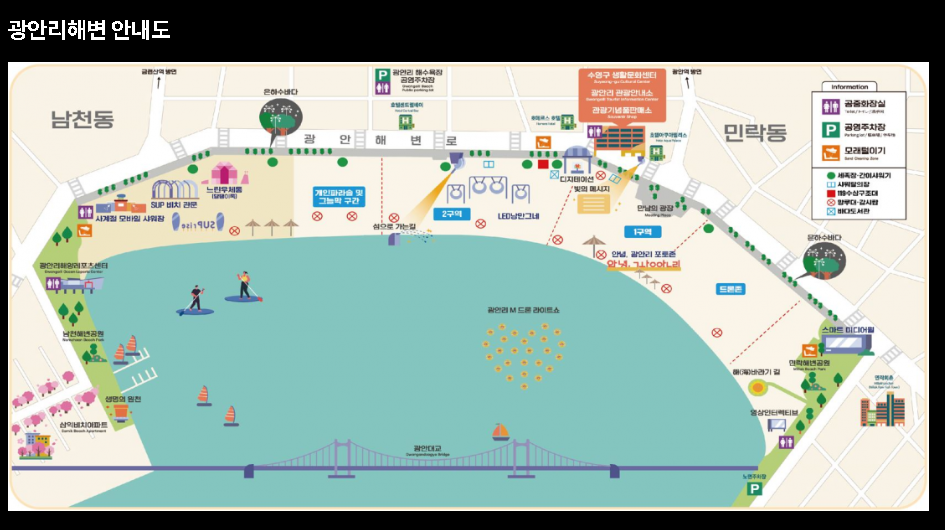 도보 여행자라면 ‘광안리역 3번 출구 → 해변 산책로 → 민락수변공원’ 코스를 추천드립니다.