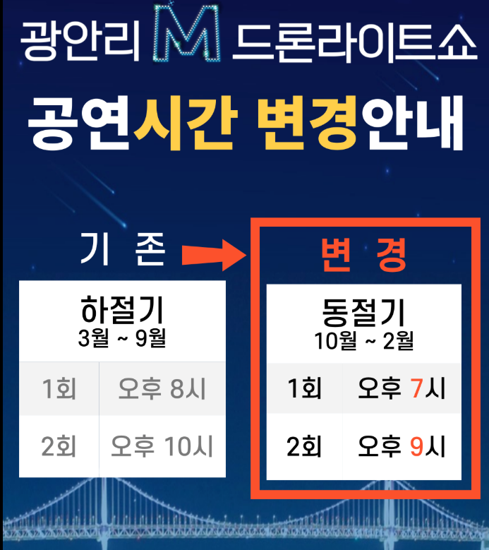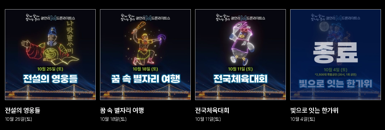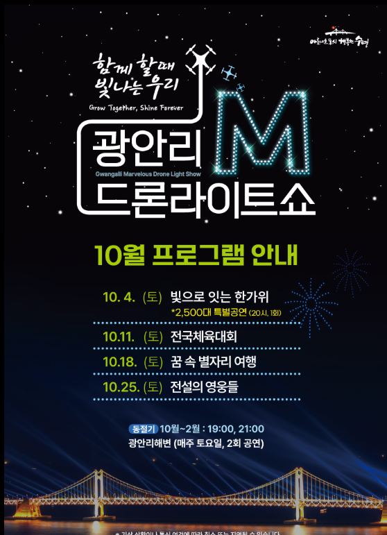 10월 광안리 드론쇼는 매주 토요일 저녁 8시에 시작됩니다.