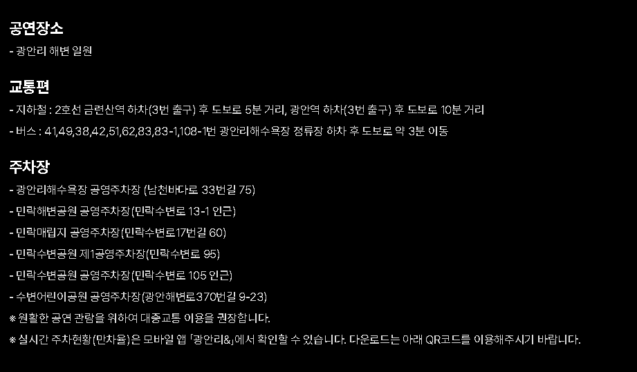 부득이하게 차량 이용 시에는 ‘민락수변공원 공영주차장’이나 ‘광안리해변 공영주차장’을 추천드려요.