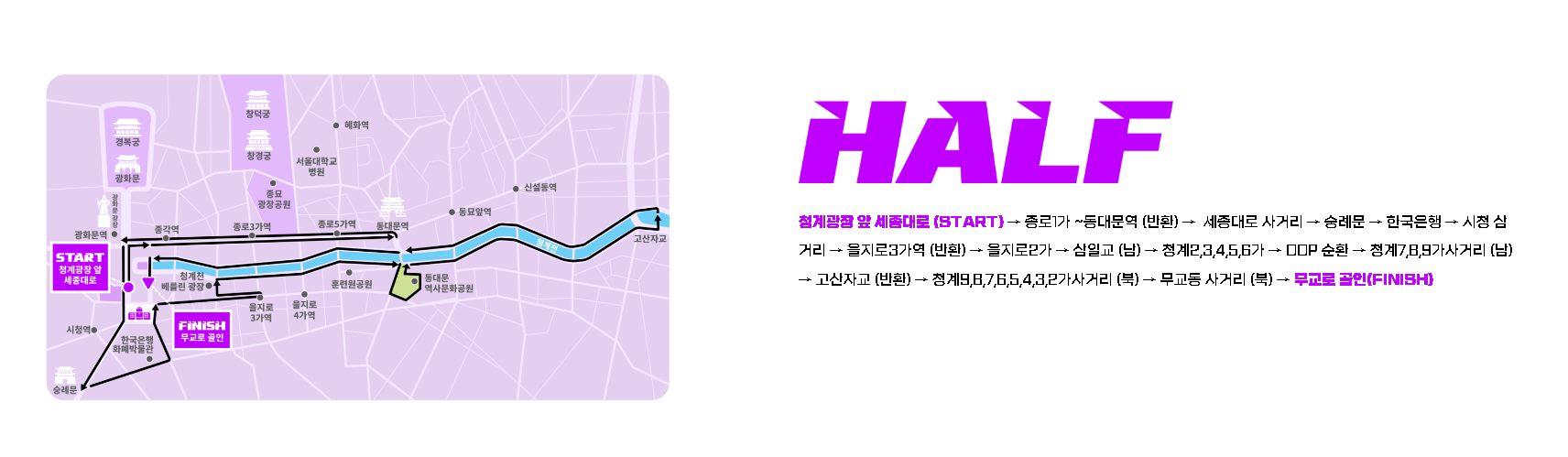 하프코스 | 서울광장–청계천–한강진입–잠실운동장 | 21.1km |