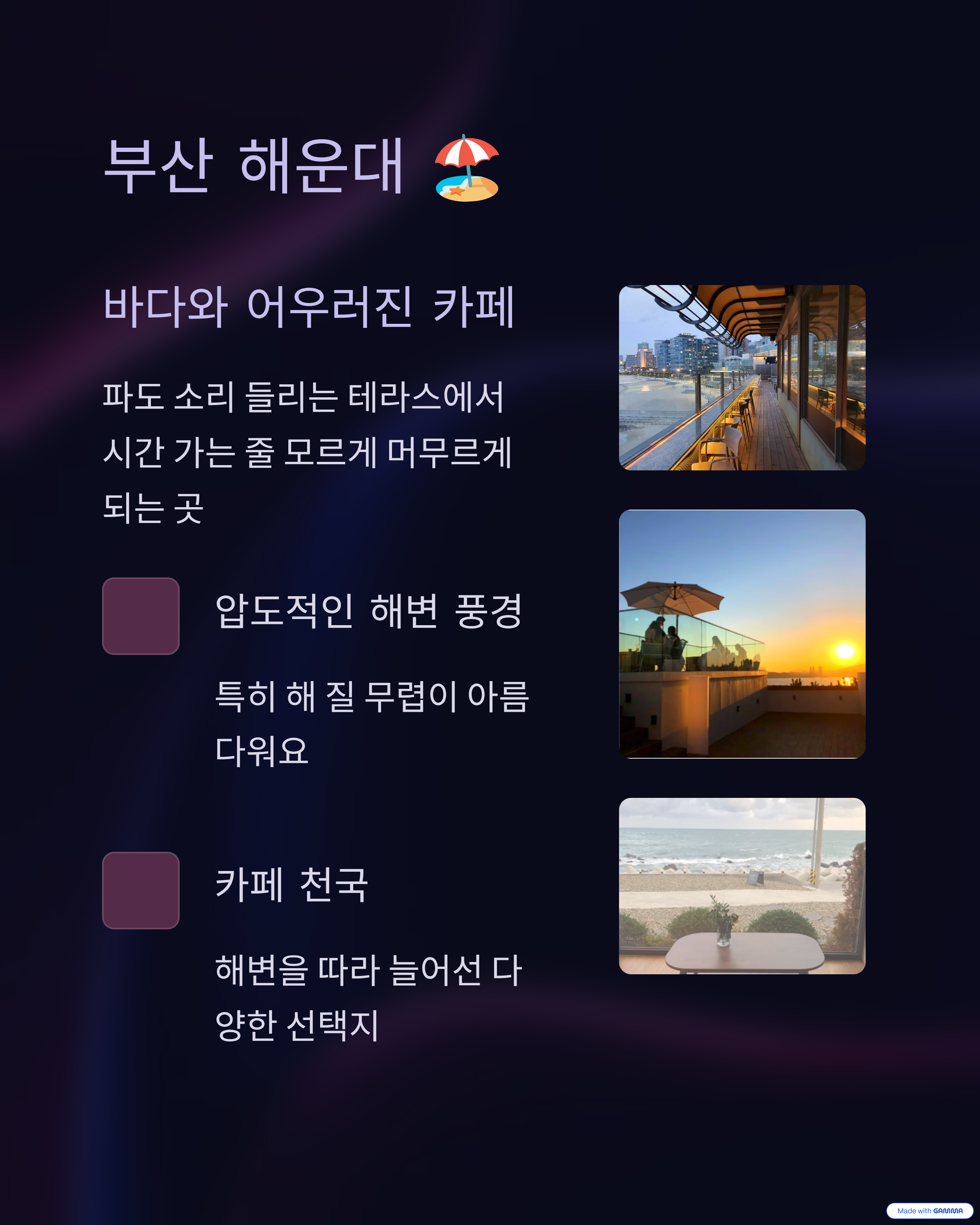 부산 해운대는 말 그대로 카페 천국입니다. 파도 소리 들리는 테라스에 앉아 있으면 시간 가는 줄 모르게 머무르게 되죠. 특히 해변을 따라 늘어선 카페들은 해 질 무렵의 풍경이 압도적으로 아름답습니다.