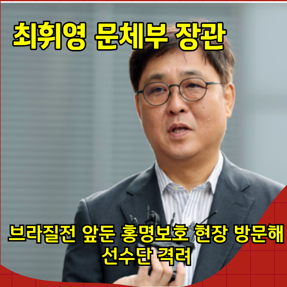 “최선을 다하는 모습이 국민에게 큰 감동” 현장 응원 메시지 전달최휘영 문화체육관광부 장관이 브라질전을 앞둔 대한민국 축구대표팀 훈련장을 방문해 홍명보 감독과 선수단을 격려했습니다. 이번 방문은 국제 친선경기를 앞두고 선수들의 사기를 북돋우기 위한 자리로, 장관은 대표팀의 노력과 열정을 직접 확인하며 응원의 메시지를 전했습니다.대표팀 훈련 현장 방문, 선수단과 따뜻한 만남최 장관은 훈련 직후 홍명보 감독과 짧은 환담을 나누며 “대표팀이 국민에게 희망과 긍지를 주는 존재”라고 격려했습니다. 또한 선수 한 명 한 명에게 악수를 건네며 “부상 없이 최선을 다해달라”는 당부를 전했습니다. 현장에는 코칭스태프와 협회 관계자들도 함께해 분위기가 한층 화기애애했습니다.브라질전 앞둔 대표팀 분위기, 결의 다져대표팀은 ..