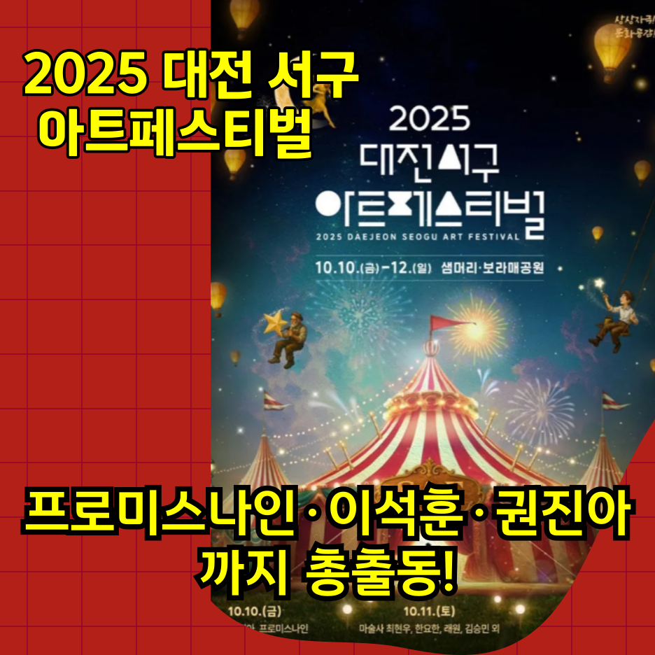 가을 밤 감성을 채우는 예술 축제, 프로미스나인·이석훈·권진아까지 총출동!2025년 가을, 대전의 대표 문화축제 ‘대전 서구 아트페스티벌’이 다시 돌아옵니다. 예술과 음악, 체험이 어우러진 이 축제는 매년 지역민은 물론 전국 각지의 관광객까지 불러모으는 대전의 대표 가을행사로 자리잡았죠. 올해는 그 어느 때보다 풍성한 프로그램과 초호화 라인업으로 기대감을 높이고 있습니다.축제 일정 및 장소 정보2025 대전 서구 아트페스티벌은 10월 11일(토)부터 10월 13일(월)까지 3일간 열립니다. 메인 무대는 대전 서구청 앞 보라매공원 일원이며, 인근 거리 곳곳에서 다양한 예술 공연과 체험 프로그램이 함께 펼쳐질 예정입니다.구분 내용축제명2025 대전 서구 아트페스티벌장소대전광역시 서구 보라매공원 일대일정202..